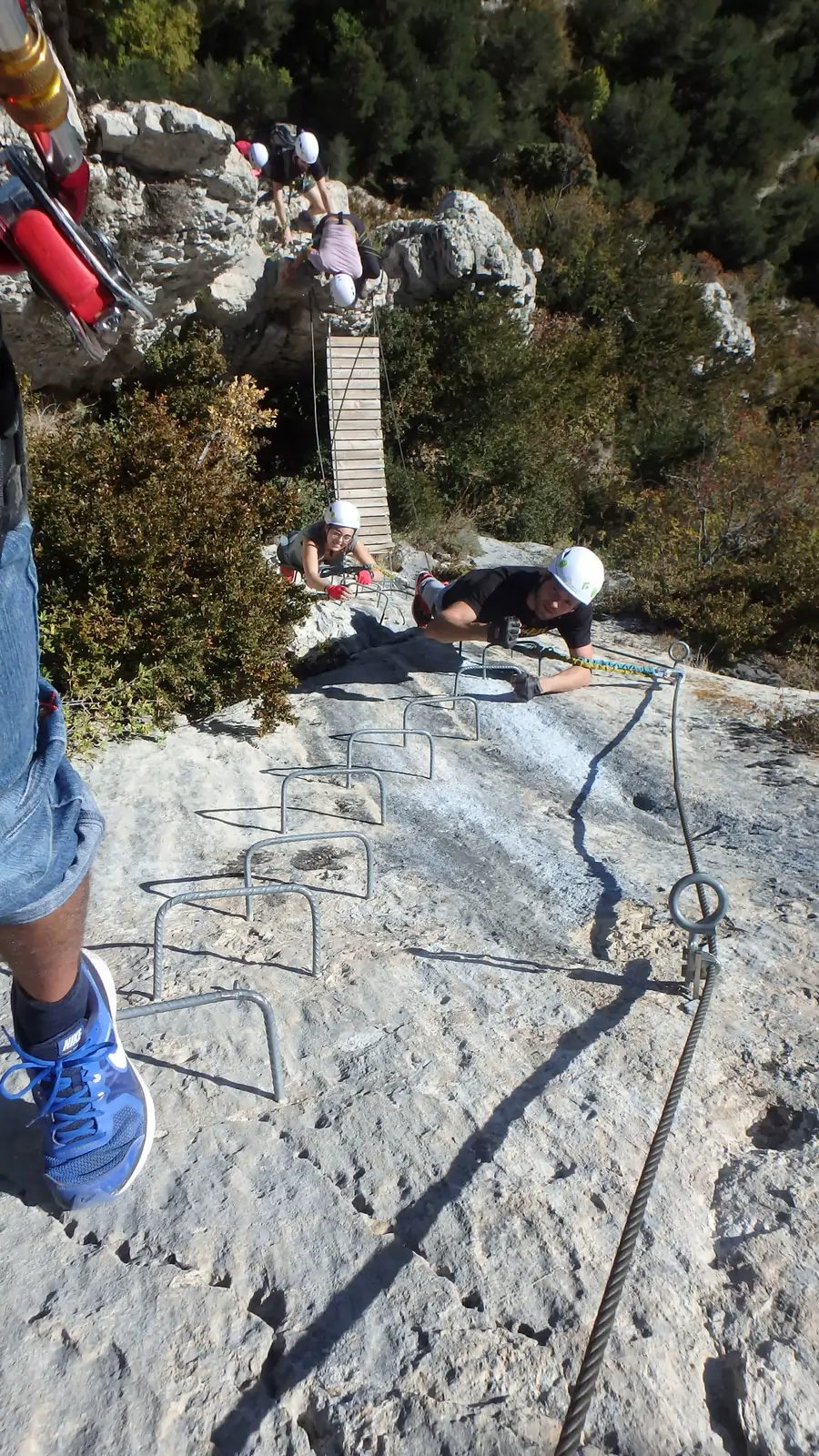 Después de aproximadamente 20 minutos de subidas y bajadas por el camino, llegaremos al inicio de la vía ferrata, donde veremos la primera pared vertical que deberemos escalar, sin desplomes.