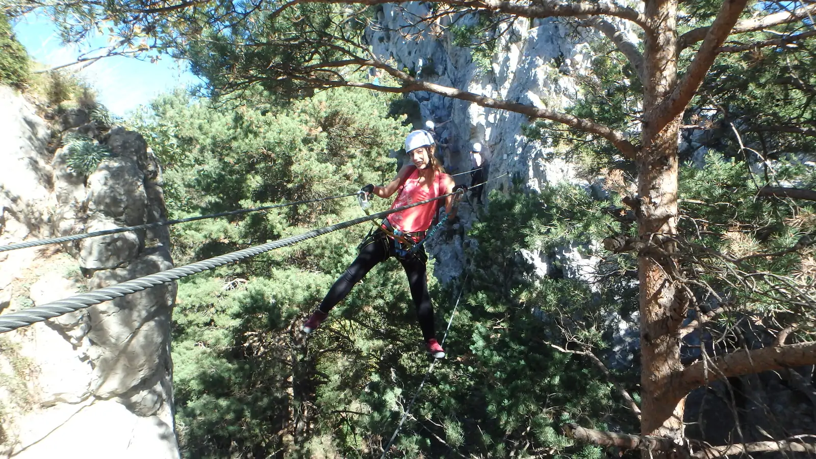 Pasaremos un tramo horizontal sobre unas plataformas de madera y luego comenzaremos a subir en diagonal hacia la derecha, donde nos enfrentaremos a nuestro primer desplome. Después de esta subida en diagonal, la vía ferrata nos dará un pequeño respiro, pero continuaremos ganando altura hasta llegar a la cima de la pared.